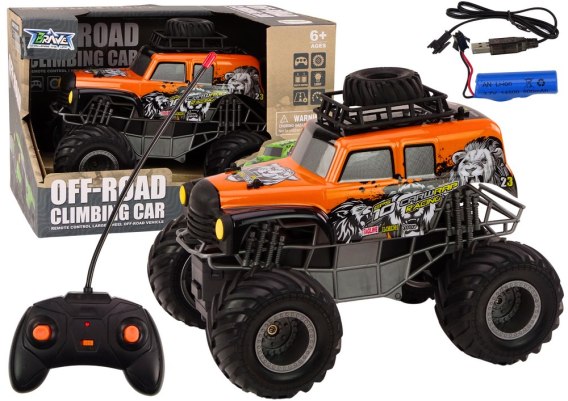 Autko terenowe w skali 1:16 to pełna przygód zabawka. Pomarańczowy kolor, duże gumowe koła, prędkość 13km/h, zasięg pilota 15m, 25 minut jazdy na pełnym naładowaniu, efekty świetlne. Idealne do eksploracji i rozwijania wyobraźni w terenie.