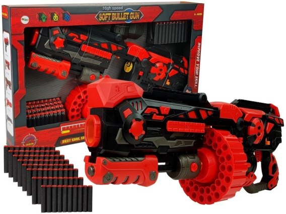 Pistolet posiada obrotowy magazynek, gdzie bez problemu można pomieścić aż 80 naboi. Zasięg strzału jest bardzo duży, bo aż 80 m! Jego budowa przypomina konstrukcję prawdziwej broni- jednak jest bezpieczna, nie posiada ostrych zakończeń i elementów. Celownik zamontowany na górze pistoletu pozwala na dokładniejsze wymierzenie celu. Aby strzelić wystarczy pociągnąć za rączkę do tyłu i strzelić! Ogromny magazynek pozwala na szybki wyrzut naboi i dłuższą zabawę, ponieważ nie trzeba co chwilę ładować.
