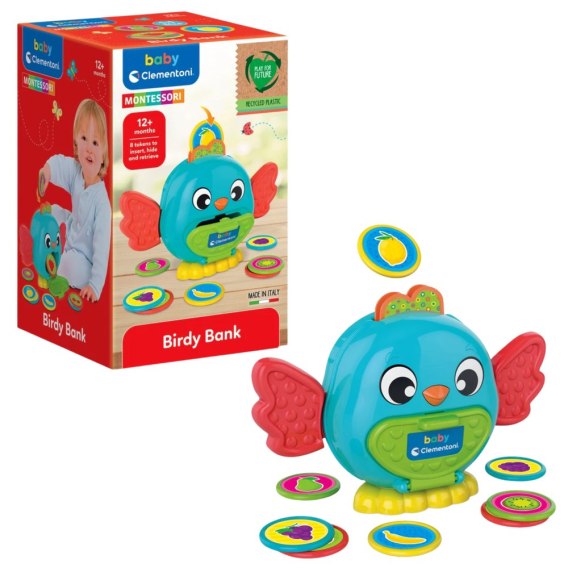 Ptaszek to zabawna skarbonka, do której dziecko może wrzucać kolorowe żetony, a następnie wyjmować je przez specjalne drzwiczki na brzuszku.
