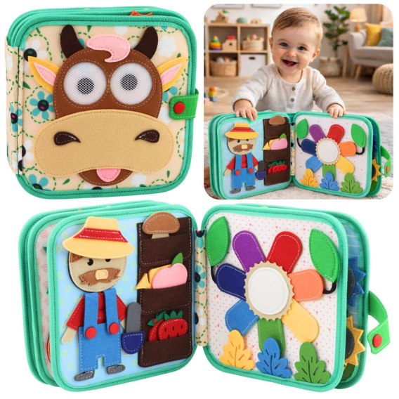 Książeczka sensoryczna filcowa z motywem krowy i zwierząt domowych to edukacyjna zabawka dla najmłodszych dzieci, która wspiera rozwój wyobraźni, zdolności manualnych oraz poznawanie świata poprzez zabawę.