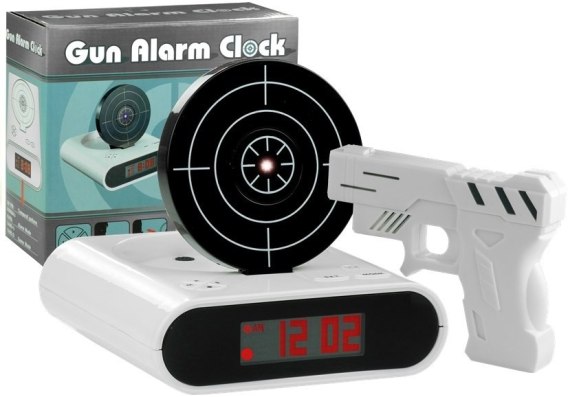 Budzik elektroniczny — pistolet laserowy z tarczą w białym kolorze