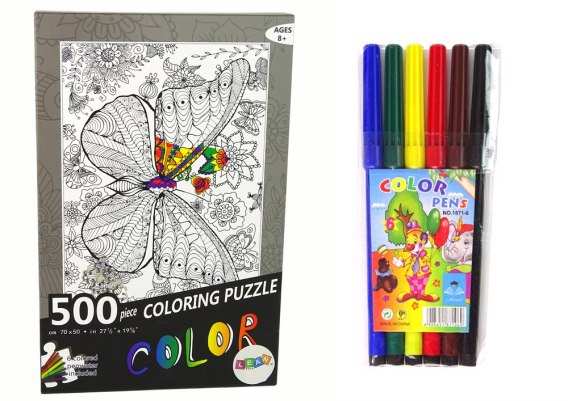 W zestawi znajdziemy 500 sztuk puzzli czarno- białych oraz 6 sztuk pisaków, którymi pomalujesz obrazek tak jak wyobraźnia podpowiada. Puzzle przedstawiają pięknego motyla w otoczeniu kwiatów.