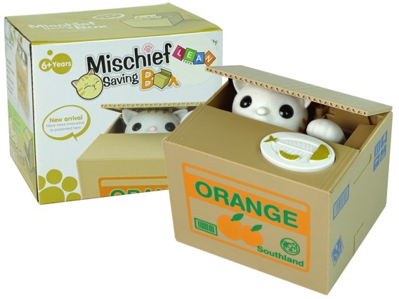 Naciśnij przycisk na budce a kot dźwignie pokrywkę i łapką wciągnie pieniążka.