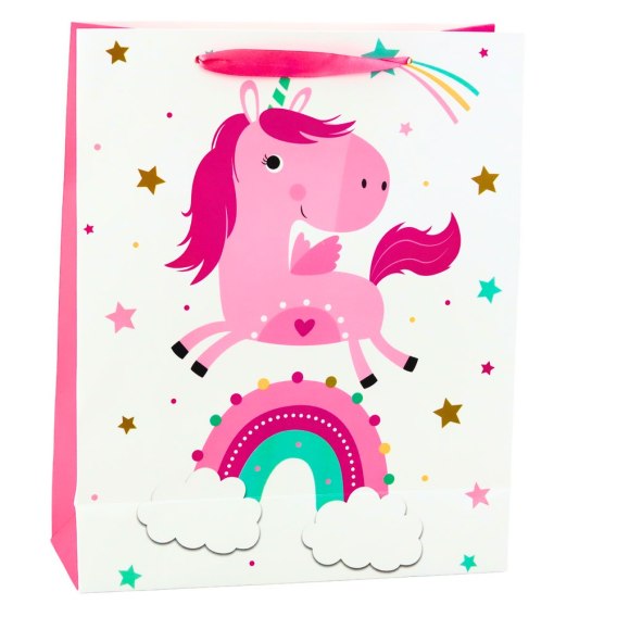 Torebka prezentowa z uroczym motywem jednorożca to idealna oprawa każdego dziecięcego upominku, która zachwyci nie tylko najmłodszych, ale również dorosłych szukających wyjątkowego sposobu na zapakowanie prezentu. Kolorowa grafika z radosnym, różowym jednorożcem stojącym na tęczy w otoczeniu chmurek i gwiazdek przyciąga uwagę i wprowadza magiczny, bajkowy klimat. Dzięki temu każdy prezent staje się bardziej osobisty i niezapomniany - już sam sposób jego wręczenia wywołuje uśmiech na twarzy dziecka.