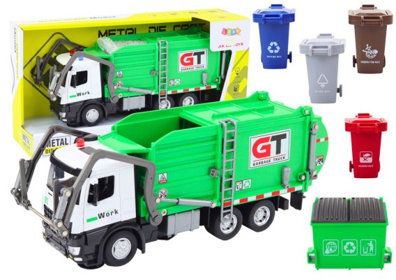 Pojazd został wyposażony w napęd frykcyjny, który umożliwia łatwe poruszanie się po różnych powierzchniach. Kolorowe kosze na odpady dołączone do zestawu pomagają dzieciom w nauce segregacji śmieci, a specjalne wycinanki z papieru imitujące odpady sprawiają, że zabawa staje się jeszcze bardziej realistyczna i interaktywna.