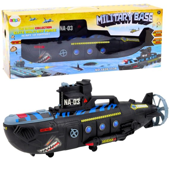 Na górze łodzi podwodnej znajduje się przycisk, który uruchamia efekty dźwiękowe, słychać odgłosy strzelania, teraz możesz zestrzelić inne statki na swoim morzu. Łódź ma zamontowane kółka, dzięki czemu może się poruszać.