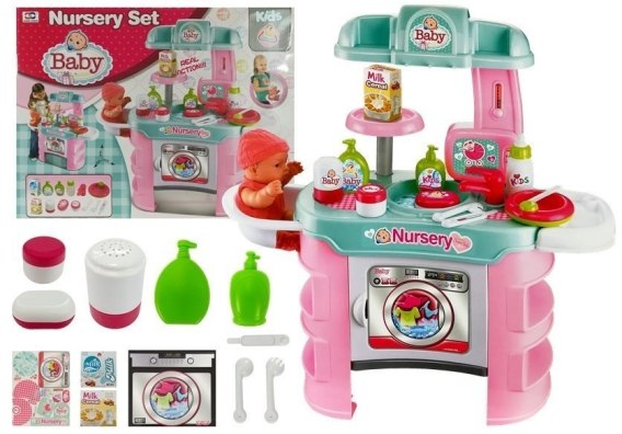 Zabawkowy zestaw do opieki nad niemowlęciem to wspaniała okazja do obserwowania jak nasza pociecha dba o swojego własnego dzidziusia, lalkę. Dzięki elementom zestawu może przygotować przepyszne śniadanie, wyprać ubranka. Stolik do opieki umożliwi te wszystkie czynności. Składa się z otwieranej pralki, umywalki z kranikiem, siedzenia dla dziecka oraz półek. W skład akcesoriów znajduje się buteleczka na talk, płyny do mycia oraz opakowanie na krem.
