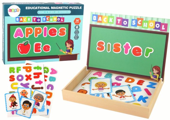 Zestaw edukacyjnych puzzli magnetycznych. W skrzynce znajdziesz litery, karty z nazwami rodzin, i tablicę magnetyczną z dwoma stronami. Jedna strona to miejsce na układanie słów, druga pozwala na rysowanie pisakiem (w zestawie). Zabawa i nauka w jednym.