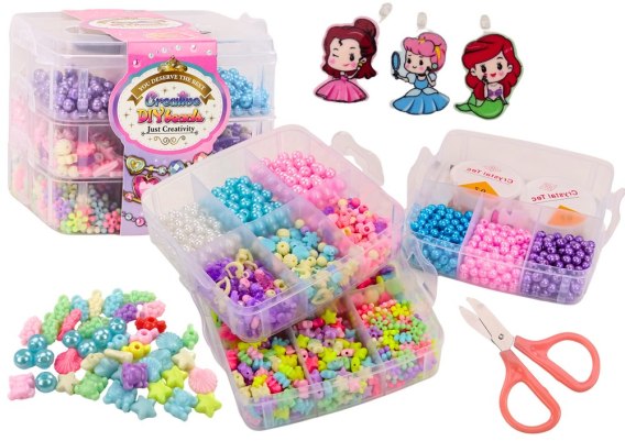 Zestaw Koralików Zawieszek zawiera aż 1620 elementów w różnorodnych kolorach, rozmiarach i kształtach. Praktyczny plastikowy pojemnik z przegródkami ułatwia organizację, a dwa komplety żyłek pozwalają natychmiast rozpocząć tworzenie biżuterii.