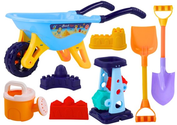 Zestaw do piasku zawiera toczkę do transportu piasku, młynek, 3 foremki w kształcie zamków, dwie łopatki (bardziej szpiczasta i szeroka) oraz konewkę. Kolorowy i bezpieczny, idealny do kreatywnej zabawy na plaży czy w piaskownicy.