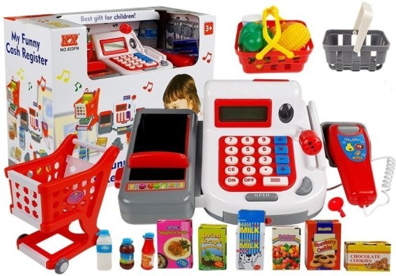 W zestawie znajdziemy mnóstwo akcesoriów niezbędnych dla każdego sprzedawcy. Pojemny wózek na zakupy, oraz dwa mniejsze koszyczki pozwolą nam spokojnie wybierać produkty. Po skończonych zakupach zapłacimy dołączonymi do zestawu banknotami i monetami. W naszym sklepie możemy również zapłacić kartą, a towar do skasowania układamy na przymocowanej do kasy taśmie, którą przesuwamy suwakiem. Mikrofon i wyświetlacz pozwolą nam do końca poczuć się jak prawdziwy kasjer.